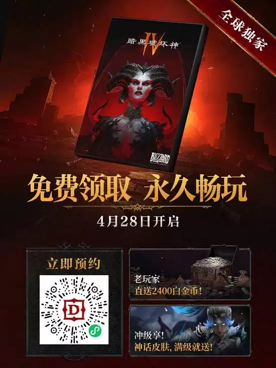 《暗黑破坏神4》国服重磅福利:本体免费送!老玩家送2400白金币 满级送皮肤 随着全新扩展包《憎恨之王》即将同步上线,《暗黑破坏神4》国服这次可是拿出了十足的诚意,准备了三重史诗级福利活动,无论是初来乍到的新朋友,还是久经沙场的老兵,都能找到属于自己的那份惊喜。 宣传视频: 首先,对于尚未踏入庇护之