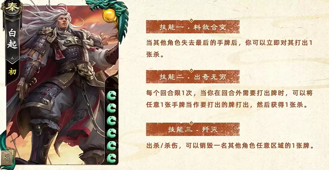 举例说明:你可以将一张【闪】当作【桃】来救援队友,随后稳定摸回一张【桃】;或者将一张【杀】当作【闪】来抵消伤害,之后再补充一张【杀】。此技能赋予了白起卓越的应变能力与近乎循环的资源补充,使其难以被轻易针对或限制。