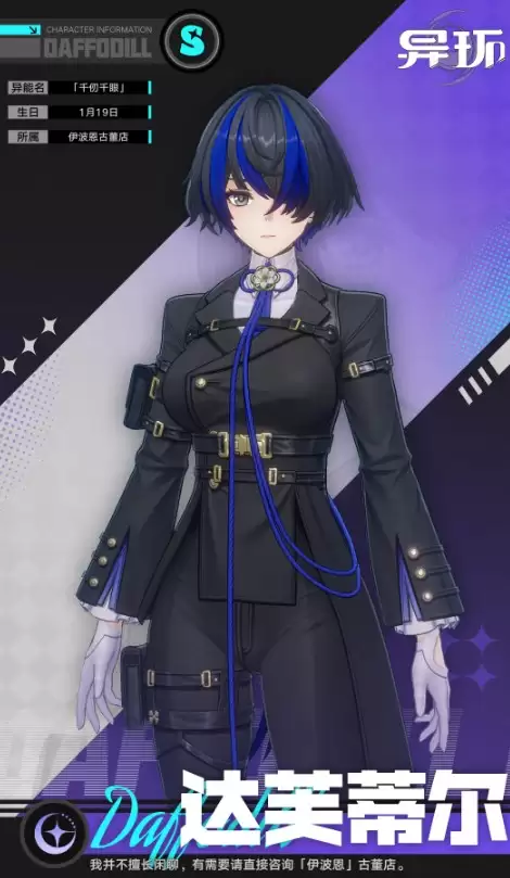 “交刃”是一个朴实的瞬发单体暗属性异能技,没有附加效果,但胜在直接。“见此终幕”则是她的范围暗属性异能终结技,命中后解放左眼,进入强化状态:期间自身所有伤害提升,同时对范围内全部敌人施加“洞察”状态,这通常意味着能为后续的战术协同(如易伤、暴露弱点等)创造绝佳条件。达芙蒂尔是一位典型的后期核心,随着战斗进程和队伍配合,她的输出能力会不断攀升,是攻坚持久战的绝佳选择。