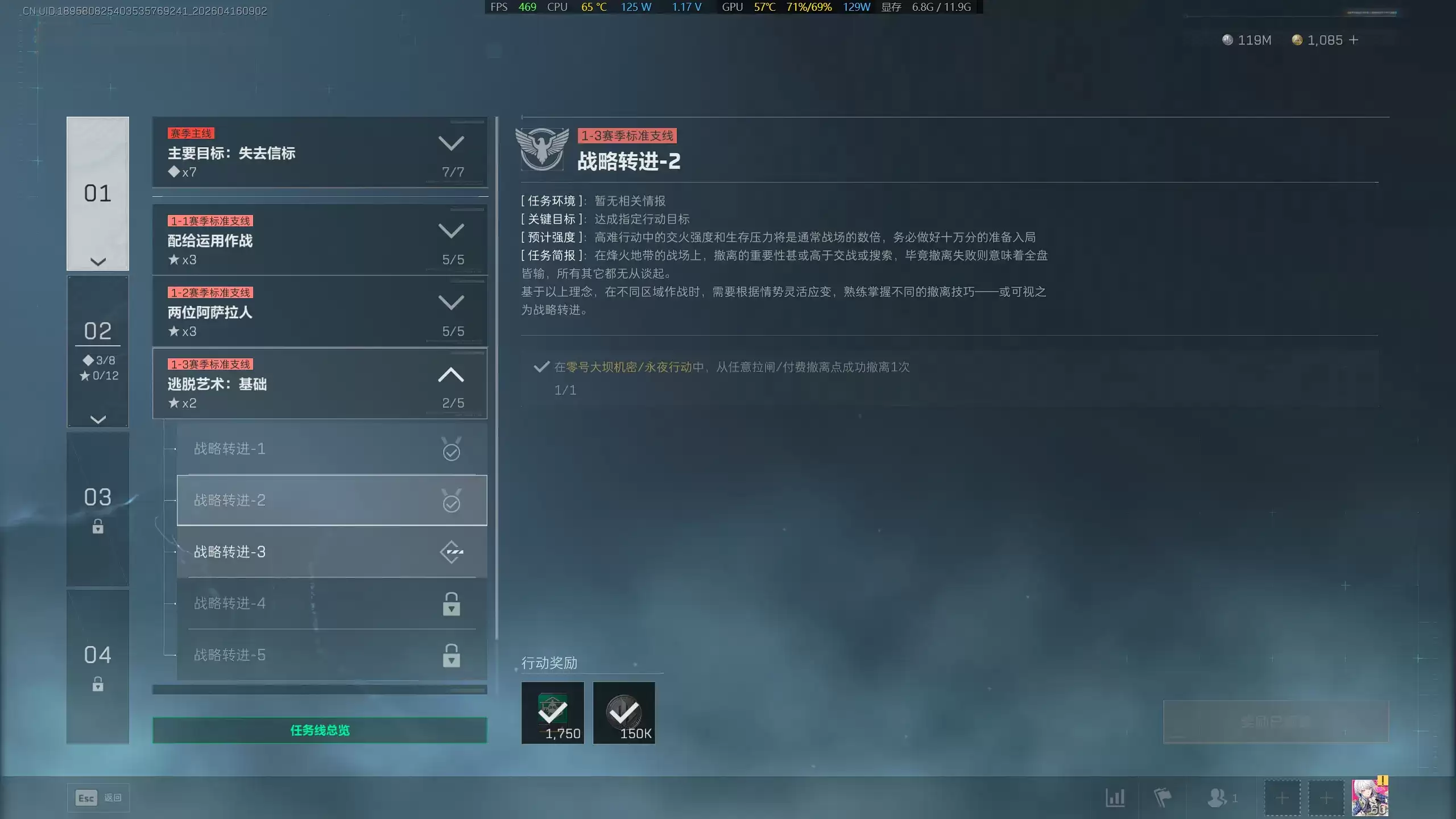 具体到“三角洲行动S9战略转进2”这一高难任务,你的核心操作要求是:在“零号大坝机密”或“永夜行动”游戏模式中,通过任意拉闸撤离点或付费撤离点,成功完成1次撤离。