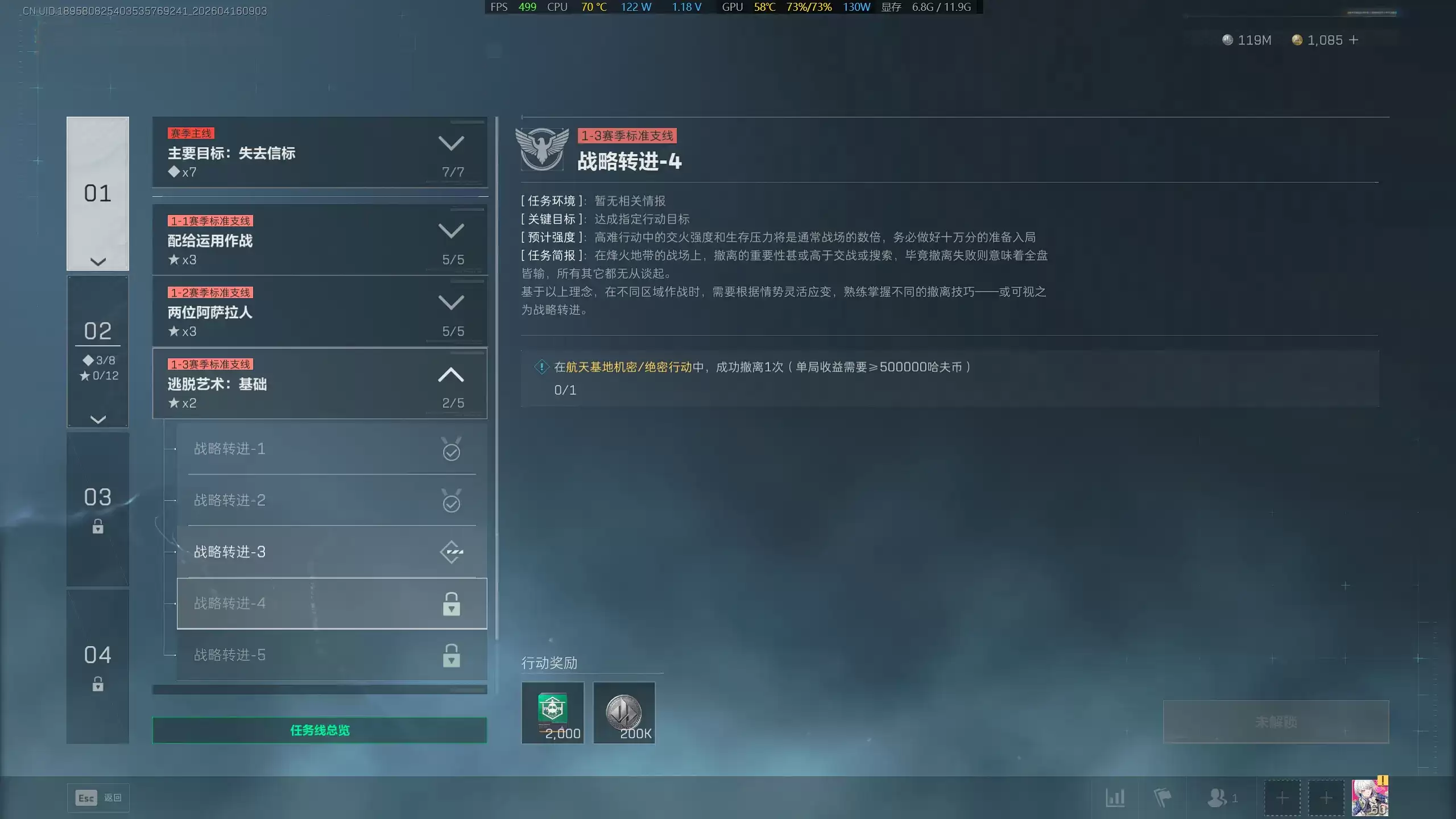 具体到“战略转进4”的挑战内容,任务要求玩家在航天基地地图的机密或绝密难度模式下,成功完成1次撤离。此处存在一个关键硬性指标:单局撤离时所携带的战利品总价值,必须超过50万哈夫币。这不仅是一次简单的撤离,更是一次对资源规划与风险收益评估能力的终极考验,要求你必须“满载而归”。