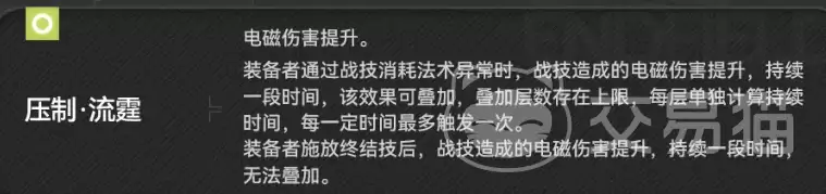 “压制流霆”效果的触发条件非常明确:当装备者通过战技消耗法术异常状态时,即可启动增益。效果启动后,战技造成的电磁伤害将获得提升,并持续一段时间。 此机制设计精妙之处在于:首先,效果支持多层叠加(存在上限),鼓励玩家进行连续作战以维持高额增益;其次,每层增益拥有独立的计时器,且单位时间内仅能触发一次。这要求博士必须精准把握技能释放节奏,将“无脑甩技能”转变为“有规划的循环输出”,极大地提升了操作上限与策略深度。