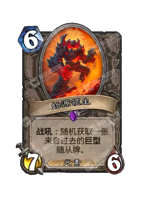 从基础属性分析,始源领主是一张极具竞争力的六费随从卡。它拥有7点攻击力和6点生命值的标准身材,在中期战场上具备优秀的站场与交换能力。更重要的是,其元素属性标签为它打开了广阔的构筑空间。