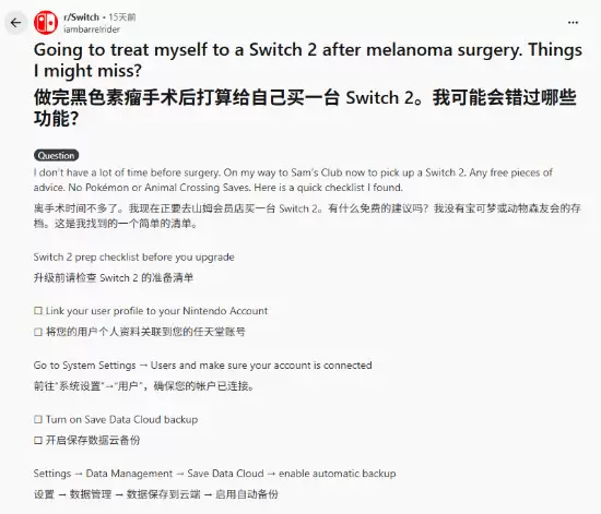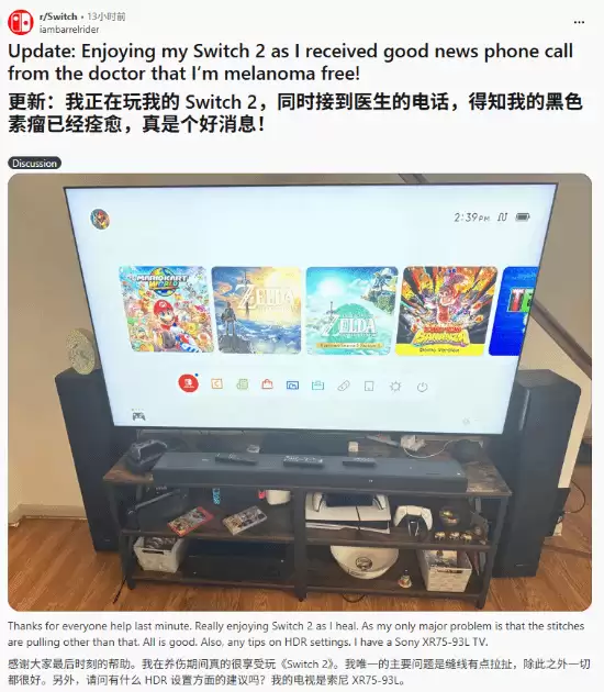 海外论坛Reddit玩家分享:用Nintendo Switch 2对抗黑色素瘤,手术成功癌症痊愈,暖心故事引发全网共鸣
