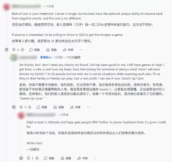 更让人感动的情节随之展开。在互动过程中,有热心网友提出要捐赠20美元帮助他购买游戏,但这位玩家礼貌而坚定地婉拒了。他回应说,希望这份善意能够传递给其他更需要帮助的人。与此同时,他还透露了一个温暖的计划:打算将自己原有的旧款Switch主机,捐赠给其他正在接受治疗的病友。一颗善意传递的种子,就此悄然埋下。