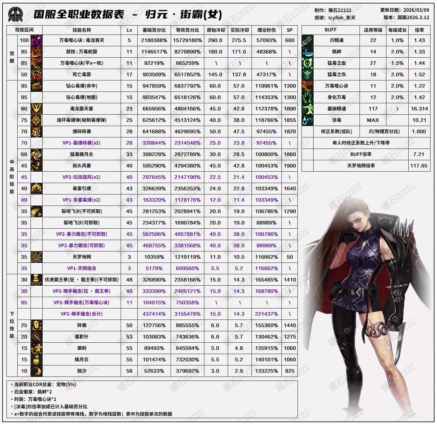 核心高伤害技能方面,“爆碎砖袭”与“毒雷引爆”的数据在全技能中占比突出,是爆发期必须打中的关键输出。而觉醒技能“万毒噬心诀”(一觉)与“禁技:万毒蛇窟”(二觉),其超高倍率的伤害数据直接决定了女街霸在短时间内所能达到的爆发上限,是终结战斗的利器。
