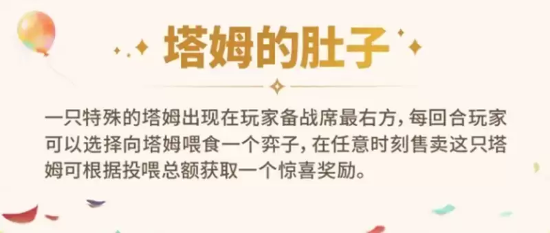 最后是“塔姆的肚子”机制,它以独立单位的形式固定在备战席最右侧。每个回合,你可以将任意一个弈子“喂入”其中,之后随时可以售出,并根据喂入弈子的总费用获得随机奖励。此机制的操作核心在于成本控制与风险规避。稳妥的策略是投入暂时用不上的1费或2费棋子,避免将核心主C或关键的高费卡喂入,从而在博取额外资源的同时,确保阵容核心构成的绝对稳定。