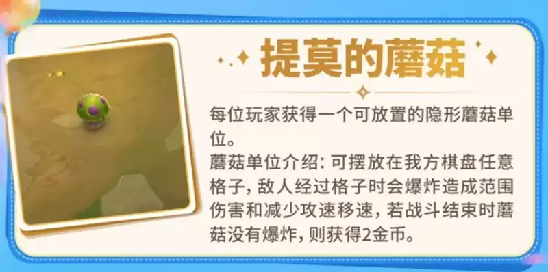 “提莫的蘑菇”是一个功能性的辅助机制。你会获得一个可部署在自己棋盘上的隐形单位,敌人经过时会触发爆炸,造成范围伤害并降低其15%攻击速度和移动速度,持续3秒。有一个细节需要注意:如果整场战斗蘑菇都未被触发,你可以回收它并获得2金币。因此,蘑菇的放置位置至关重要,需要预判敌方后排输出英雄的常见站位区域,随意放置会浪费其战术价值。