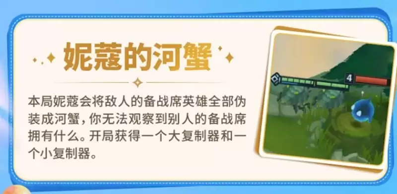 当遇到“妮蔻的河蟹”机制时,你的博弈策略需要彻底转变。该机制会隐藏所有对手的备战席,你看到的将全是河蟹图标,无法侦察对手的阵容走向。作为补偿,开局时系统会赠送一个【大型复制器】和一个【小型复制器】。这意味着依赖观察对手来调整阵容的“偷师”玩法完全失效。此时,你必须更加专注于自身的内功运营,牢牢把控经济节奏与核心羁绊的成型速度。开局获得的复制器是珍贵资源,应优先用于复制你已确定要追三星的低费核心卡,或是后期关键的五星高费卡,切忌随意使用,造成资源浪费。