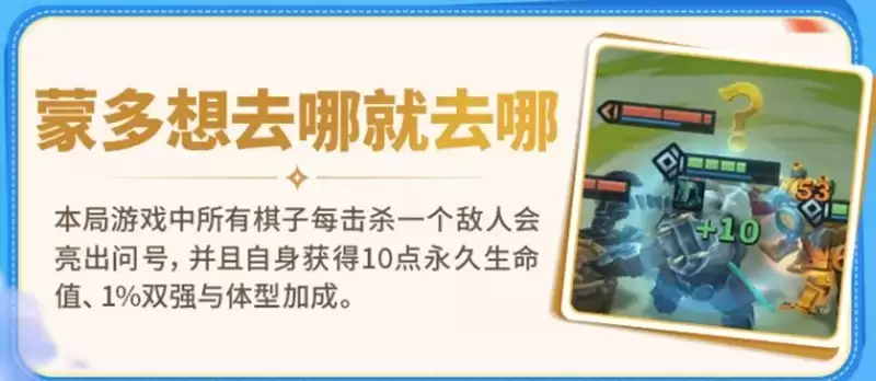 “蒙多的效果”是一个典型的“滚雪球”型全局成长机制。所有友方棋子每击杀一个敌人,就会永久获得10点最大生命值、1%双抗加成,并且体型会略微变大(头顶有可爱的问号标识)。这个增益的成长性非常可观,前提是你能维持高频率的击杀。因此,尽量在前中期通过强势运营保持连胜,快速累积属性,棋子们在中后期的单体强度将会获得指数级的提升。