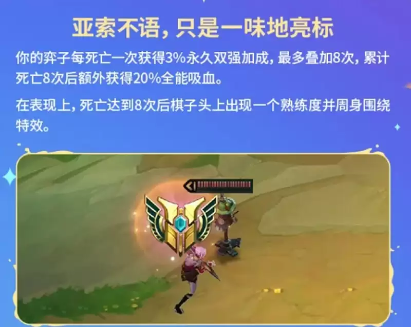 “托儿索”是一个典型的“以战养战”成长型符文。效果为:我方单个棋子每阵亡一次,全队永久获得3%双抗加成,最多可叠加8层。层数叠满后,全队还将额外获得20%全能吸血,并且角色头顶会出现专属特效。这个机制鼓励玩家进行“战略性减员”的规划。在游戏中期,可以通过可控的牺牲来快速叠满层数;进入后期,凭借高额的双抗和全能吸血,整个团队的持续作战能力将产生质变。
