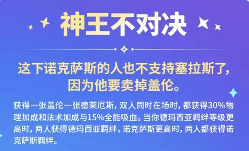 在强化符文选择上,“神王不对决”是一个需要明确阵容构建思路的选项。它要求你同时上场盖伦和德莱厄斯,激活后,两位神王将共享30%攻击力、30%法术强度以及15%全能吸血。此外,他们还会根据场上激活的更高星级的【德玛西亚】或【诺克萨斯】羁绊,获得对应的羁绊效果。此符文的核心在于“协同”与“专精”。阵容构建必须围绕德玛西亚或诺克萨斯其中一条羁绊进行深度投资,切忌两条羁绊都浅尝辄止,否则羁绊等级不足将导致双核输出大打折扣。