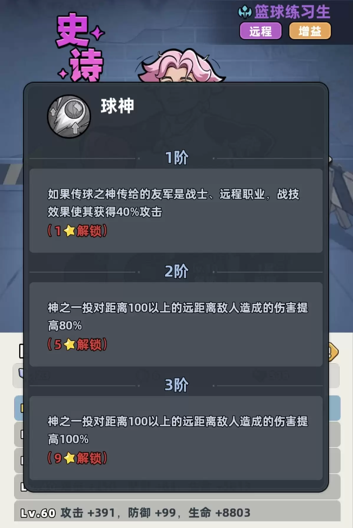 其技能组设计极具协同性。战技“随机传球”开局即可为三名队友施加攻击力增益,技能升级后受益目标可扩展至四名,增益持续时间长达4秒,而冷却时间仅5秒。这意味着在标准战斗循环中,队伍几乎能享受高达80%时间覆盖的攻击力提升,大幅增强整体输出效率。终极技能“跳投篮球”为范围伤害,基础倍率可观且随等级成长显著,并对远程敌人有额外伤害加成,在清理分散敌群时表现尤为出色。被动技能“团队激励”进一步强化协同:当传球对象为战士或远程职业时,其获得的攻击加成比例将额外提升。综合而言,篮球练习生在游戏前期的AOE清场效率位列全角色前列,堪称开荒阶段不可替代的推图核心与团队发动机。