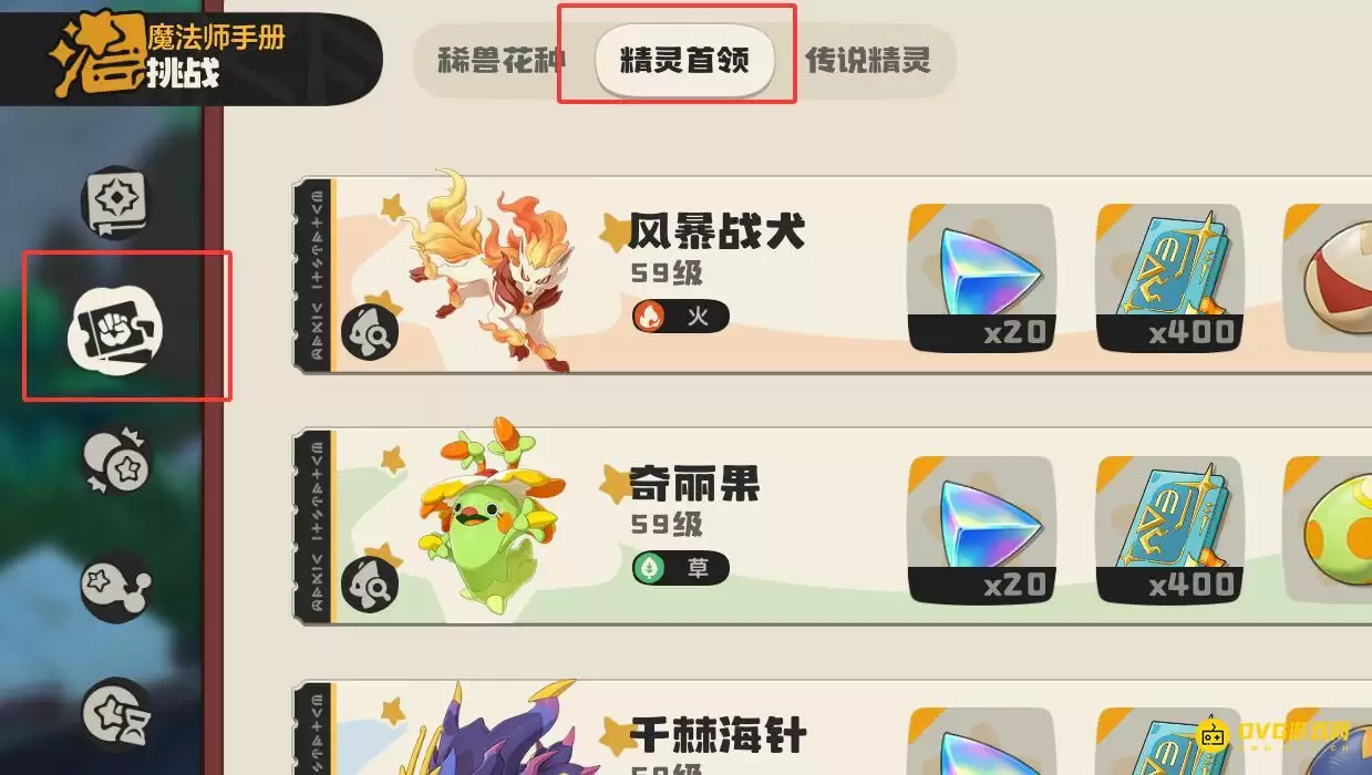 3. 最后,在挑战列表中精准定位【精灵首领】这一项。成功挑战并击败精灵首领后,您将有机会获得蕴含其血脉的精灵蛋。将此蛋孵化,得到的精灵便是产出“首领血脉凝露”的关键材料。