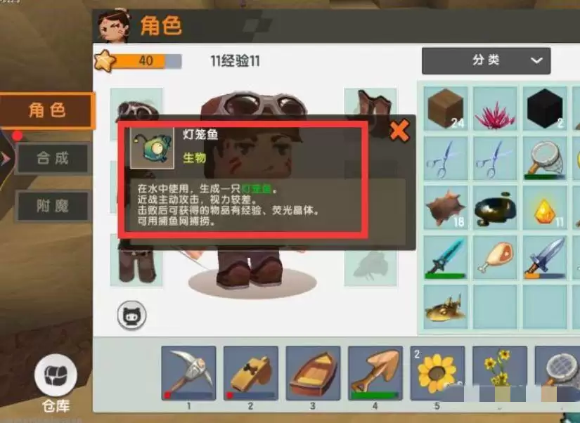 随后,打开你的物品背包,找到其中那条特殊的灯笼鱼道具并将其取出。这条灯笼鱼是制作荧光晶体的关键材料。