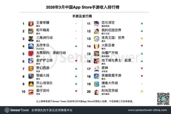 Sensor Tower 数据显示,腾讯旗下经典IP续作《洛克王国:世界》已于3月下旬正式登陆中国iOS平台。游戏上线后迅速登顶iOS应用总下载榜榜首,并于3月27日成功超越《王者荣耀》与《和平精英》,一举夺得中国iOS手游畅销榜冠军宝座。