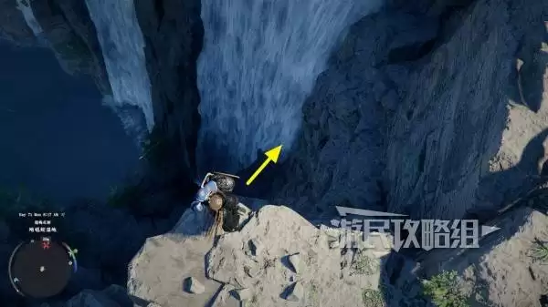 具体的寻找路线其实非常清晰。首先,你可以根据游戏内地图或下方提供的截图,导航至巨大瀑布所在区域。抵达瀑布前后,请注意不要直接进入主瀑——你需要找到右侧的第一条独立瀑布。在此处向下观察,可以看见一个突出的岩石平台。确认位置后,直接从该处跃下。