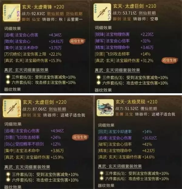 法宝是提供稳定持续伤害的基石。仙魔剑与三巨剑的组合,构成了可靠的基础伤害来源。在选择飞剑词条时,万仞、玄天等词条能显著提升整体伤害面板;而剑影词条则能使攻击间隔错开,避免所有飞剑同时攻击——这既能防止伤害溢出浪费,也能有效缩短攻击真空期。