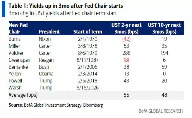 具体风险因素包括劳动力市场意外提速、地缘整治背景下美元走弱,以及新任美联储主席Warsh就任后的初期鸽派预期——历史数据显示,过去7位美联储主席上任后前三个月内,美债收益率平均上升50个基点。