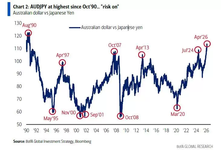 与此形成对比的是,XLF跌破200日均线,金融板块的疲软暗示此轮上涨缺乏足够市场广度。澳元兑日元同期升至1990年10月以来最高水平,Hartnett将其视为风险偏好极度高涨的缩影,同时也将这一"周期性货币对避险货币"的极端强势列为市场过热的参考指标之一。