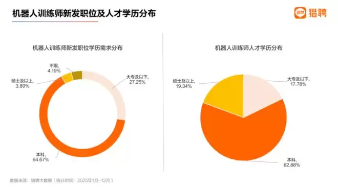 报告显示,去年机器人训练师的招聘平均年薪为19.5万元。从其新发职位的学历要求来看,本科仍是主流门槛,占比约64%。但值得注意的是,大专及以下学历要求的岗位接近三成,另有少量岗位不限学历,整体用人结构显得较为开放和多元。