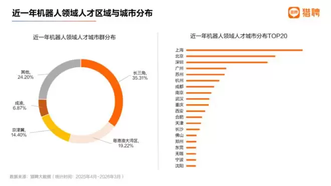 从城市群维度观察,长三角以35.31%的人才占比位居首位,粤港澳大湾区与京津冀紧随其后。这三大核心城市群合计占比超过六成,无疑是机器人产业最重要的人才集聚区。