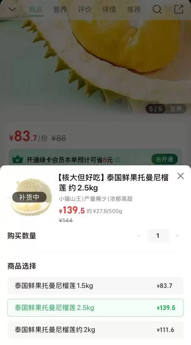 转到叮咚买菜APP,泰国鲜果托曼尼榴莲的价格约为每斤27.9元,其中2kg和2.5kg规格的同样显示“补货中”。
