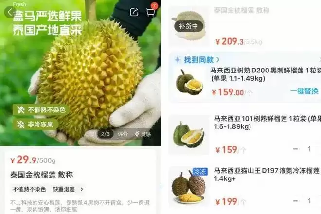 那么,眼下市场上的实际行情究竟如何?记者随即在几个主流生鲜平台进行了探查。在盒马APP上,泰国金枕榴莲的标价是每斤29.9元,不过页面显示正处于“补货状态”,看来是供不应求。