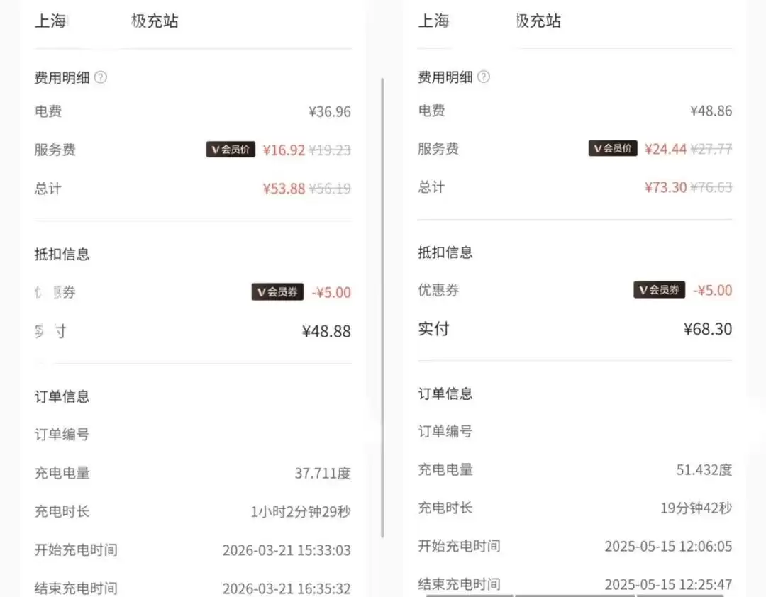 你看,对于用车强度最高的网约车群体而言,充电涨价似乎并未构成实质性的冲击。那么,在写字楼、商场这些办公区域呢?情况同样复杂。以笔者自身经历为例,在同一栋写字楼的同一个充电桩,去年充电51.43度花费68.3元,单价约1.32元;而今年充电37.71度,缴费48.88元,折合单价约1.29元——由于各种优惠券叠加,单价不升反降。