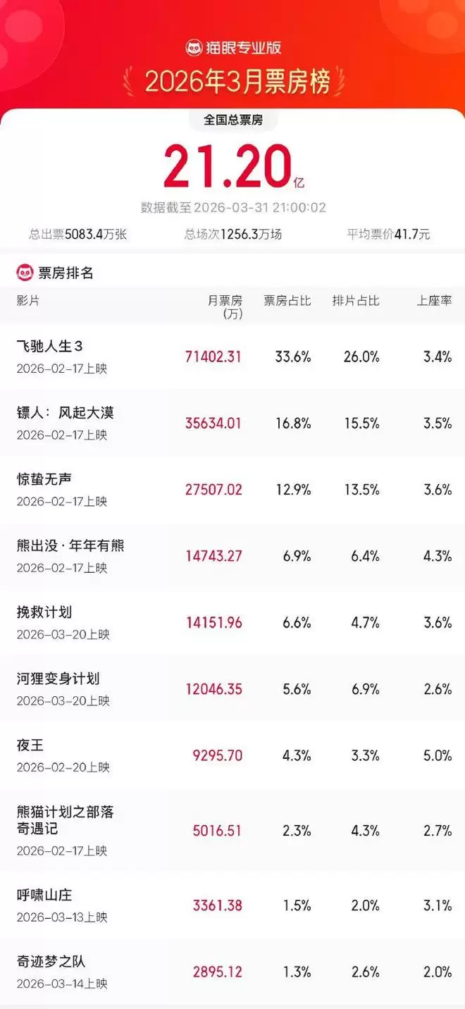 三月国内电影市场为第一季度画上了一个稳健的句号。根据猫眼专业版实时票房统计,截至3月31日晚21时,三月全国电影总票房最终定格于21.20亿元。这一成绩的取得,主要得益于多部头部影片的持续票房号召力与稳定的市场输出。