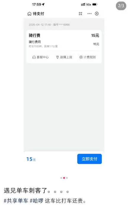 “追风者”被一些用户戏称为“单车刺客”,原因在于其价格已逼近短途网约车。有用户发帖称,自己骑行13分钟便被收费15元。查阅其计费规则可以发现,该车型区分工作日、周末和节假日三档计价,上述情况正对应“前30分钟15元”的标准。这意味着,只要开锁起步,最低消费就是15元。更关键的是,这类高端车型通常不参与普通月卡的折扣。