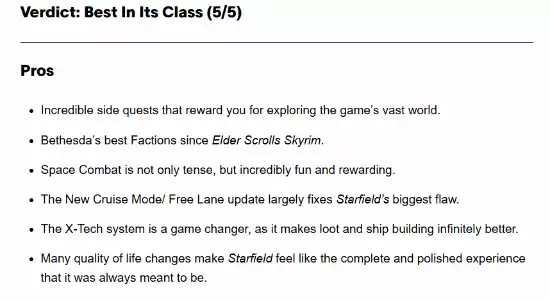 支线任务设计精妙绝伦,探索过程带来的回报感与成就感极其强烈;各大阵营的塑造与刻画堪称贝塞斯达近年来的最佳水准;太空战斗场面紧张刺激,操作乐趣十足;通过“自由航道”等重大更新,游戏有效解决了早期版本中的一些核心体验缺陷;X-Tech系统极大地拓展了装备驱动与飞船自定义玩法的策略深度;海量的性能与内容优化让PS5版的整体游戏体验更完整、更精致。