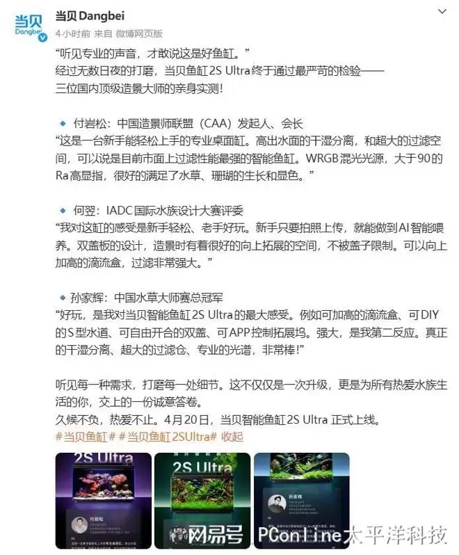 距离当贝智能鱼缸2S Ultra上线还有两天。从昨天那张写着“久等了”的海报开始,大家就一直在猜:这次到底升级了什么?当贝倒是沉得住气,今天直接请来了付岩松、何翌、孙家辉三位在造景圈真正有话语权的人物,让他们亲手摸、亲眼看、亲自养,然后用自己的判断告诉大家,这台鱼缸到底行不行。而他们的评价里,也透露了不少关键细节。