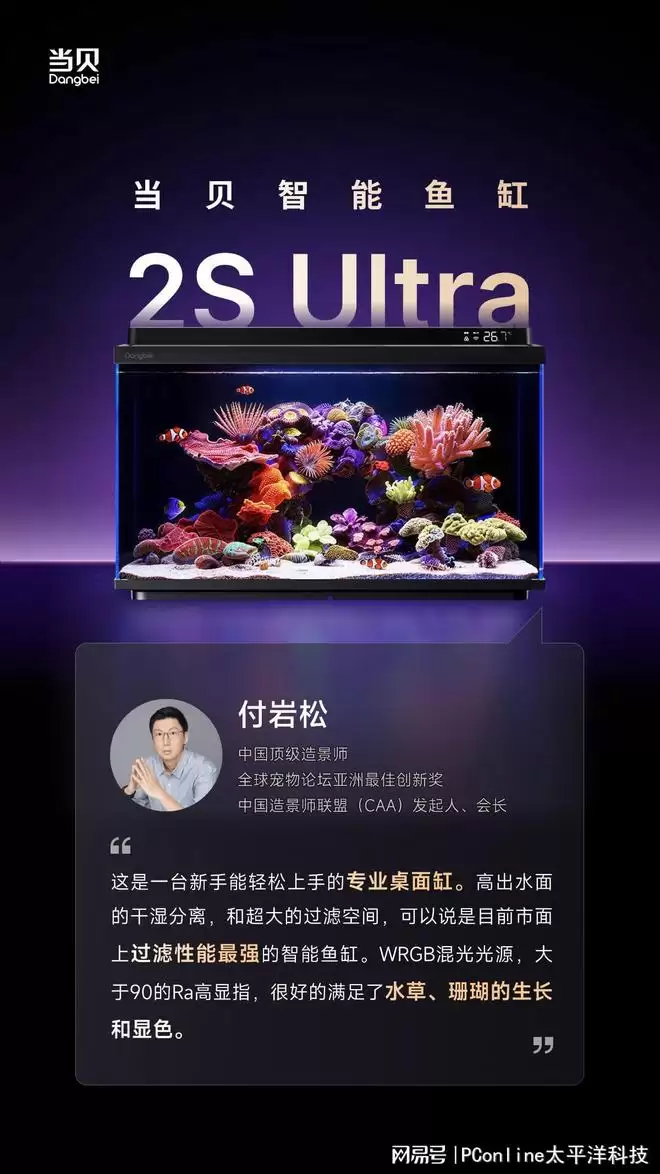付岩松,中国造景师联盟发起人兼会长,他的评判标准在圈内是出了名的高。对于当贝鱼缸2S Ultra,他给了一句分量极重的评价:“目前市面上过滤性能最强的智能鱼缸。”懂行的人一听就明白,这背后意味着什么。他特别点出了两个核心细节:一是高出水面的干湿分离设计,水流先经过物理过滤层再落入缸中,有效避免了有机物在水下长期浸泡导致的水质恶化;二是超大的过滤仓提供了充足的余量,能容纳更丰富的生化滤材,从而保障水质的长期稳定。灯光方面,WRGB混光光源搭配Ra大于90的高显色指数,对水草和珊瑚的生长与显色表现都相当友好。在造景圈,显色指数直接决定了水草在缸里的颜色质感,Ra能到90以上,基本上就告别了“灯照出来颜色发灰”的尴尬。