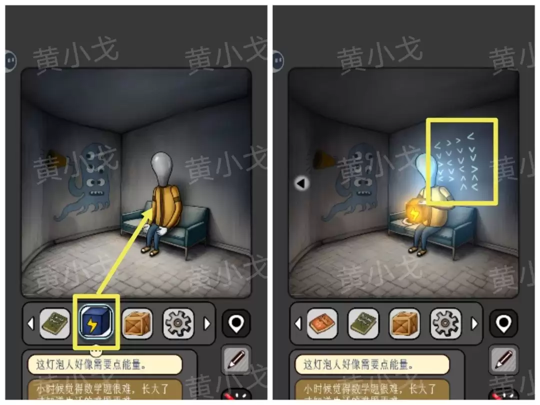 15. [灯泡人充能]将【蓝色能量块】交给灯泡人,它会亮起并揭示墙上的关键图案线索,请务必记住。