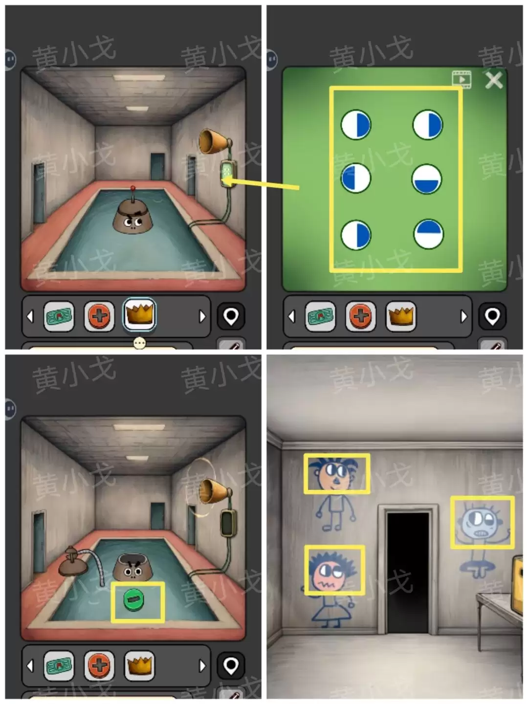 22. [泳池二次机关]再次点击装置上的机关,本次需依据[打印机]场景墙上的人物眼睛朝向涂鸦(右右,左下,右上)来解开机关,从而获得【➖按钮】。