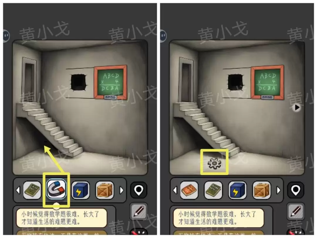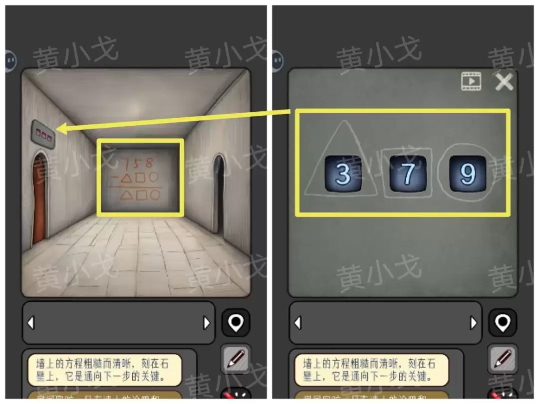 1. [初始大门]点击门上的图形密码锁,界面提示(△□○)需结合墙面等式“758-△□○=△□○”进行解读。该等式可转化为一道简单算术:758减去一个三位数等于它本身,即该三位数为758的一半。因此,密码是379。