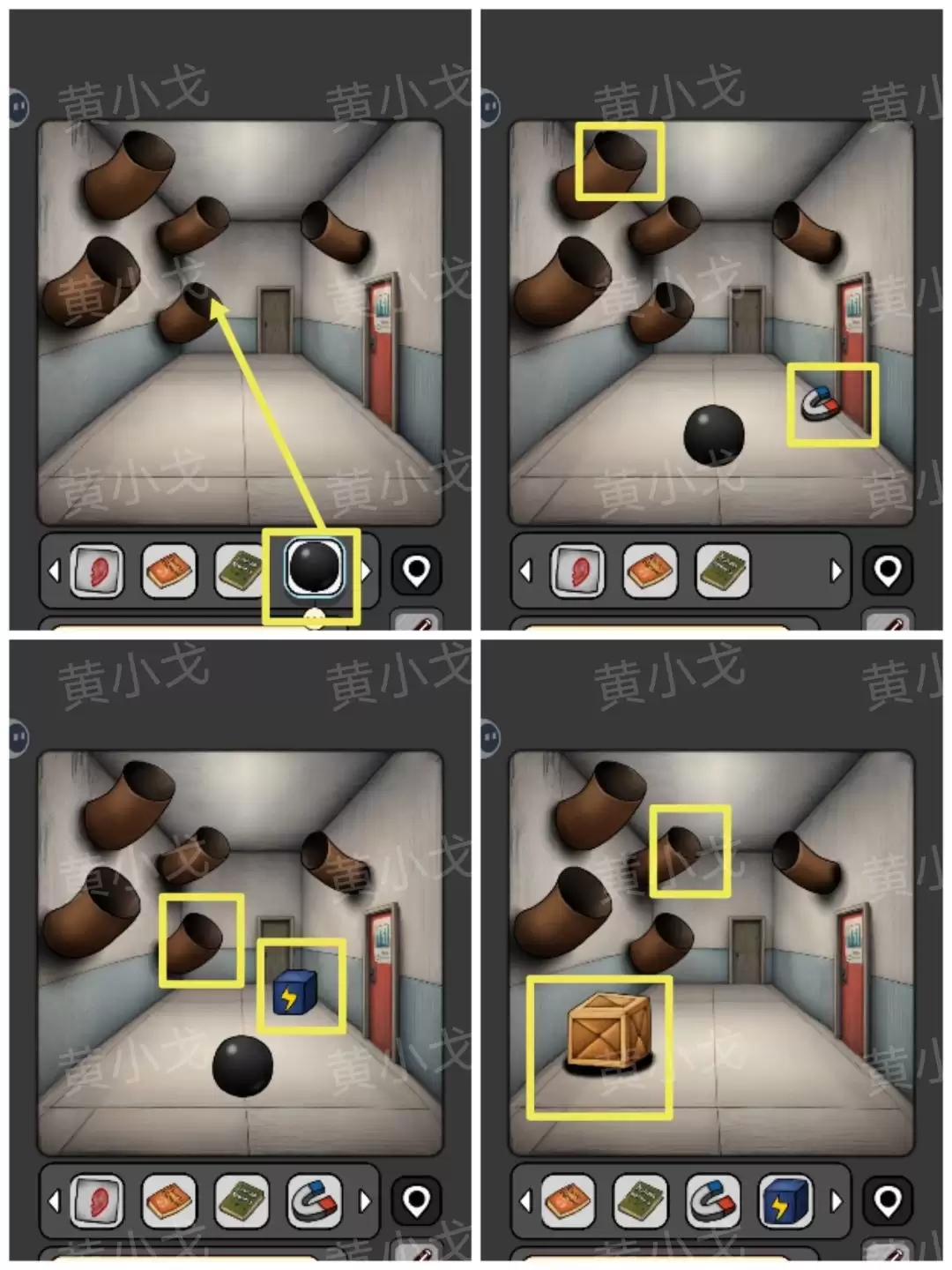 13. [管道投掷]将【铁球】投入不同的管道洞口,可分别获得三样道具:【磁铁】、【蓝色能量块】和【木箱】。