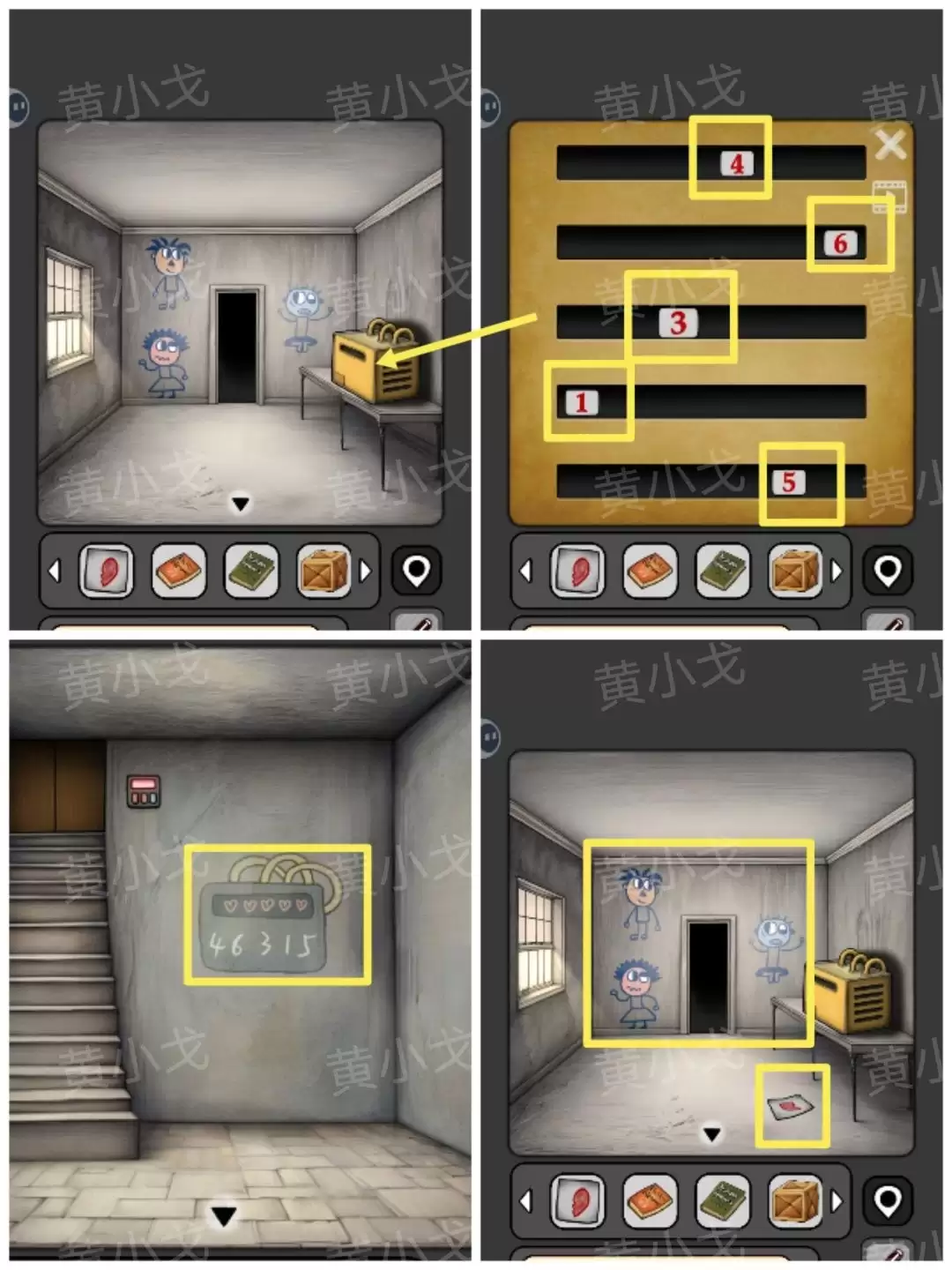 17. [打印机密码]点击打印机上的密码锁,根据[通往阳台的楼梯]场景墙上的涂鸦“46135”来调整锁盘,正确输入后可拾取掉落的另一个【耳朵】。同时,注意此场景墙上的人物眼睛朝向涂鸦:右右,左下,右上。