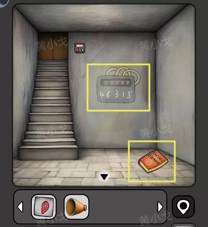 2. [台阶画框]此处的画框密码锁需要解开一个数字推理等式,找出ABCD各自代表的数字。正确答案为2178。开启暗格后,请务必拾取掉落的道具【耳朵】。