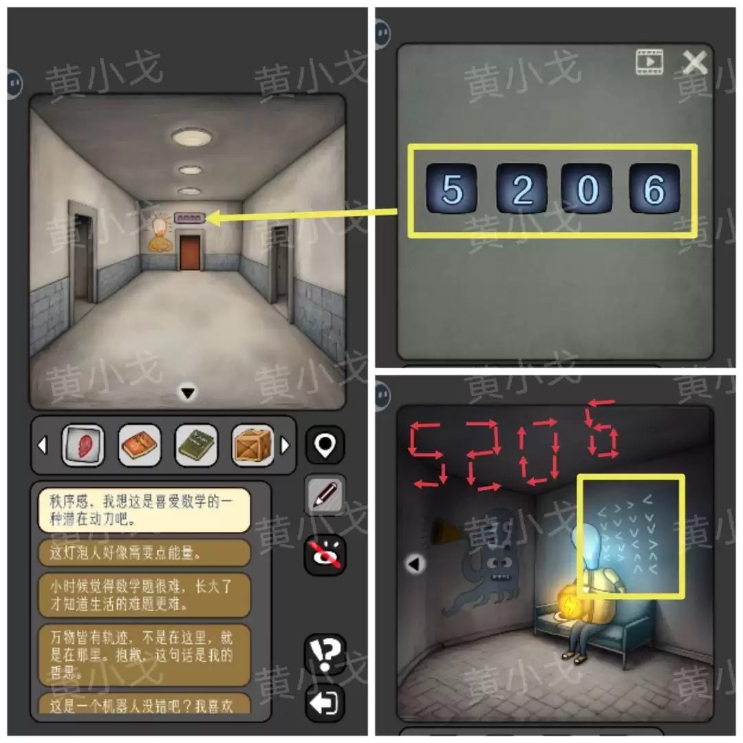 16. [灯泡图案门锁]点击门上的密码锁,锁面的灯泡图案提示需结合[灯泡人]场景墙上显示的图案进行解读。解密思路是“按照箭头方向连接亮起的灯泡”,将形成4组数字,对应的四位密码为:5206。