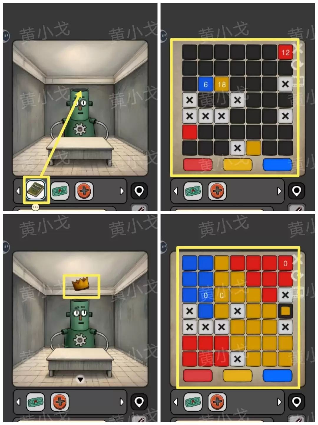 21. [绿色机器人游戏二]接着,将【绿色的书】交给同一个机器人。再次点击游戏机,完成第二个颜色顺序游戏(正确顺序为:蓝黄黄蓝蓝红红红黄黄黄),成功后获得【皇冠】。