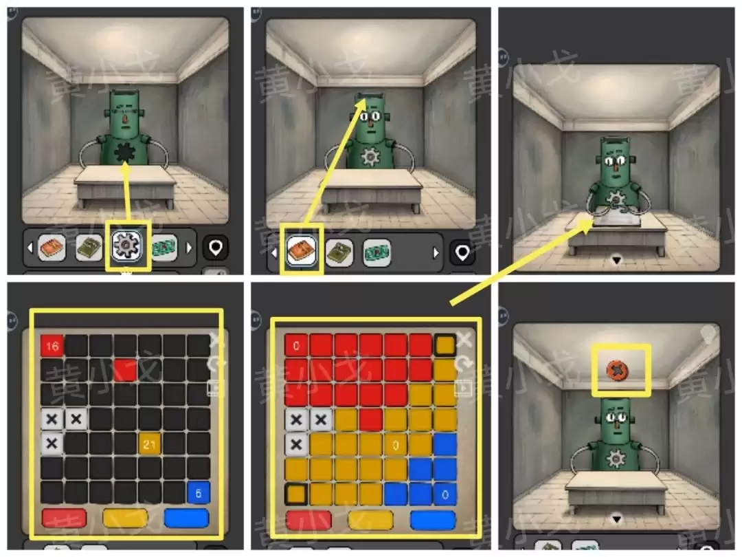 20. [绿色机器人游戏一]首先,为机器人装上【齿轮】,然后将【红色的书】交给它。点击旁边的游戏机,完成颜色顺序记忆游戏(正确顺序为:红红红蓝蓝黄黄黄黄黄黄),即可获得【➕按钮】。