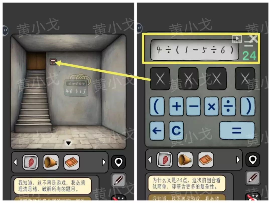 7. [第二个24点谜题]点击此场景墙上的密码锁,完成另一组24点计算。使用数字4、1、5、6,一个可行的解法是:4 ÷ (1 - 5 ÷ 6) = 24。同样需用完全部四个数字,且算式不宜复杂。