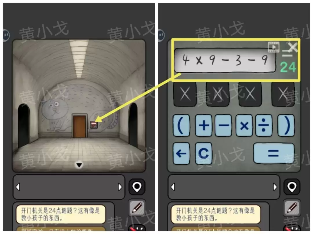 5. [猫与24点]点击墙上的密码锁,完成24点计算谜题。使用给出的数字4、9、3、9,一个有效的算式是:4 × 9 - 3 - 9 = 24。请注意,算式应尽量简洁,过长可能导致系统无法识别。