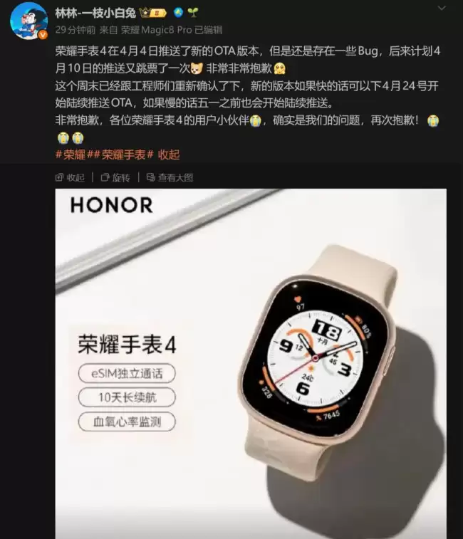 林林在微博中坦言,这款手表在4月4日确实推送过一个新版本,但后续发现版本中仍存在一些Bug。原定于4月10日的后续推送也因此推迟了一次。对此,他直接表达了歉意,承认这确实是团队方面的问题。