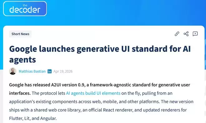 谷歌发布A2UI 0 9标准:为生成式AI交互界面建立统一设计规范 来源:环球网 【环球网科技综合报道】4月20日消息,据外媒The Decoder报道,谷歌近日正式发布了生成式AI用户界面设计标准A2UI 0 9版本。该标准旨在为AI智能体构建用户界面元素提供一套统一的规范框架,支持开发者从现有应