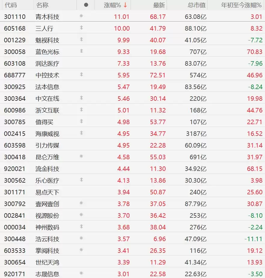 板块内赚钱效应显著扩散。中控技术、法本信息、中文在线及浙文互联等多只个股涨幅均突破5%。值得买、海康威视、引力传媒、昆仑万维、流金科技与乐心医疗跟涨,幅度维持在4%以上。此外,易点天下、壹网壹创、视源股份、神州数码、浩云科技、掌阅科技、世纪天鸿、志晟信息等公司股价也普遍上扬,录得超过3%的涨幅。