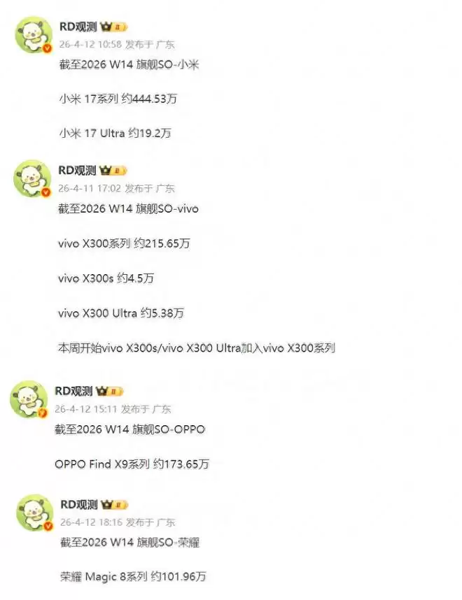 知名行业数据机构“RD观测”发布的周度销量报告,已成为洞察智能手机市场动态的关键风向标。继公布整体市场排名及热门单品榜单后,其针对主流品牌核心旗舰系列的专项数据分析也正式出炉。本文将聚焦小米17系列、vivo X300系列、OPPO Find X9系列以及荣耀Magic8系列这四大国产高端旗舰机型,为您详细解读它们在2026年第15周(W15)的最新市场表现与竞争态势。