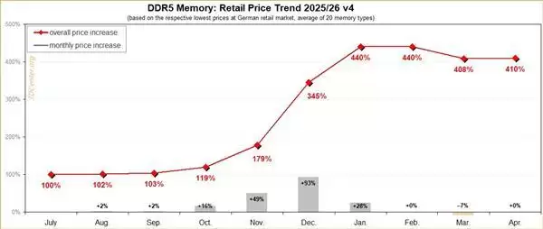 快科技4月20日消息,据3DCenter监测数据,德国市场DDR5内存套条均价已反弹至去年7月水平的410%,今年3月出现的短暂降价被证实仅为昙花一现。